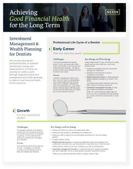 At Nexus, we can help you define a path through integrated investment management and wealth planning to achieve Good Financial Health – for the long term. Download the Professional Life Cycle of a Dentist: Nexus’s tailored investment management and wealth planning process to help you achieve your financial goals.