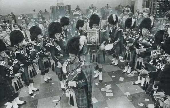 Suddenly, there was a commotion at the doors from the north stairwell leading on to the trading floor. And what was that horrible high-pitched squeal?! The doors opened and onto the floor, behind a phalanx of about half a dozen traders, marched a Scottish Highland band, dressed in kilts with bagpipes a-blaring. The traders leading the parade had hats out, and as they slowly marched around the floor, traders, boothies and post boys rushed to fill the hats with 5’s and 10’s and, I daresay, a few 100’s. Knowing that it would be a slow day, one of the traders had organized the event to raise funds for the Yonge St. Mission, a charity that, to this day, provides generous support to street-involved youth, families in need and community development in Toronto.