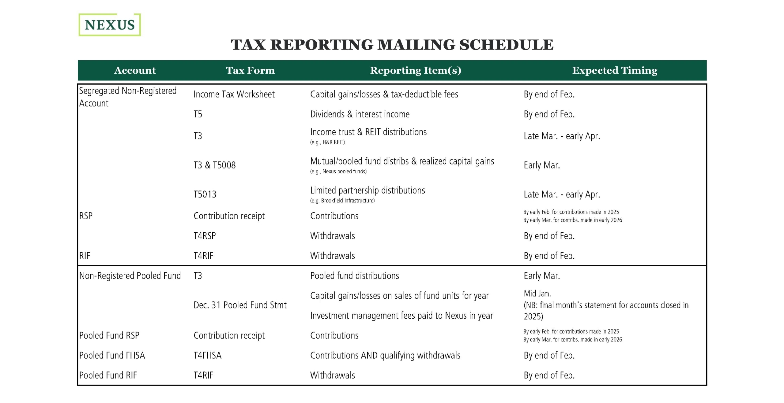 In addition to the above tax slip list, we have outlined what our clients can expect to receive, and when you will receive it. Our mailing schedule contains a list of the various tax slips and related documents that the custodian will be sending directly to you. View it below or download it here.